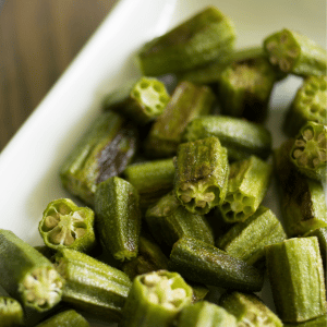 It doesn’t get much easier than this, friends! For a delicious, slime-free side of okra, simply chop okra into 1/3” pieces and place onto a baking sheet. Drizzle with olive oil, season with salt and pepper, toss, and bake in the oven at 400 degrees for about 10-12 minutes, until slightly tender.