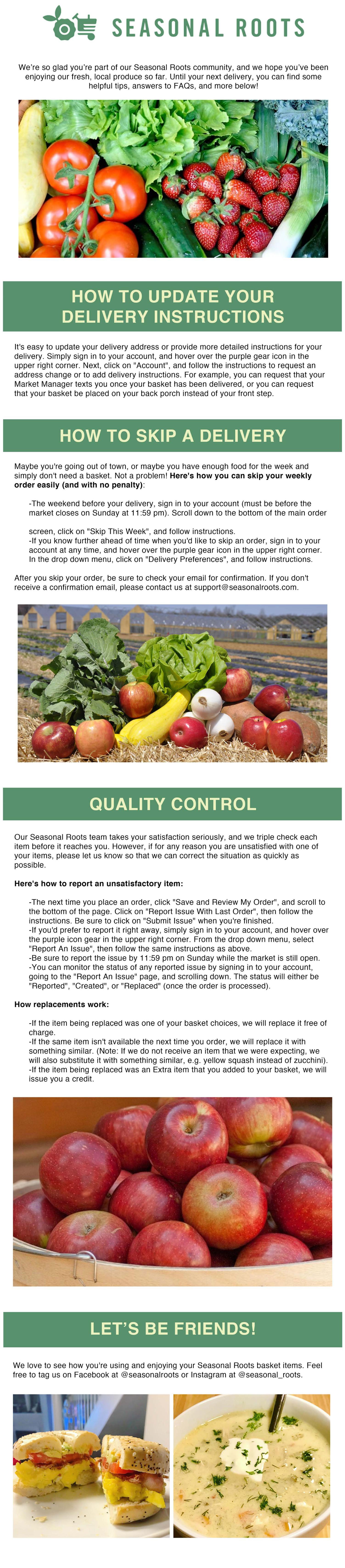 Since 2011, Seasonal Roots’ online farmers market has connected Virginia families with local family farmers who use sustainable, humane practices. Our neighborhood market managers – who believe in living better through scrumptious, healthy eating, being kind to animals, protecting the environment, and spreading joy – home-deliver freshly harvested produce, pastured eggs, grass fed dairy and meat, plus artisan fare. We empower our members to eat better and live better with more nutritious, flavorful food that’s good for us and good for the planet. More info at seasonalroots.com.