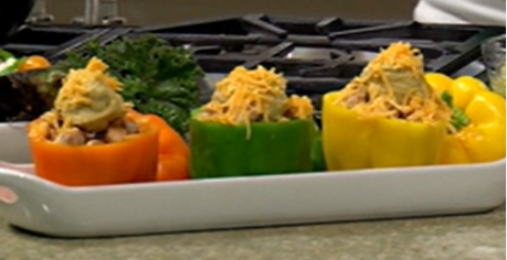 - Stuffed bell peppers filled with chicken mixed with pico-poco salsa and topped with avocado-cilantro hummus and grated cheddar cheese.