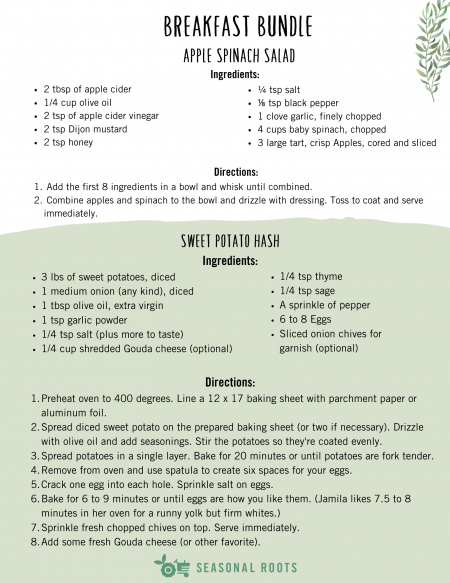 The recipes for the Sweet Potato Hash and Apple Spinach Salad are below. Feel free to click on the image and download the recipe for future reference.