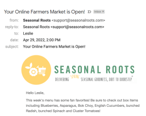 Each week, we have nearly 200 items available on the Seasonal Roots online farmers market. On Friday, you’ll receive a Market Open Email at 2pm that highlights which seasonal produce, new artisan goods and bundles are available.