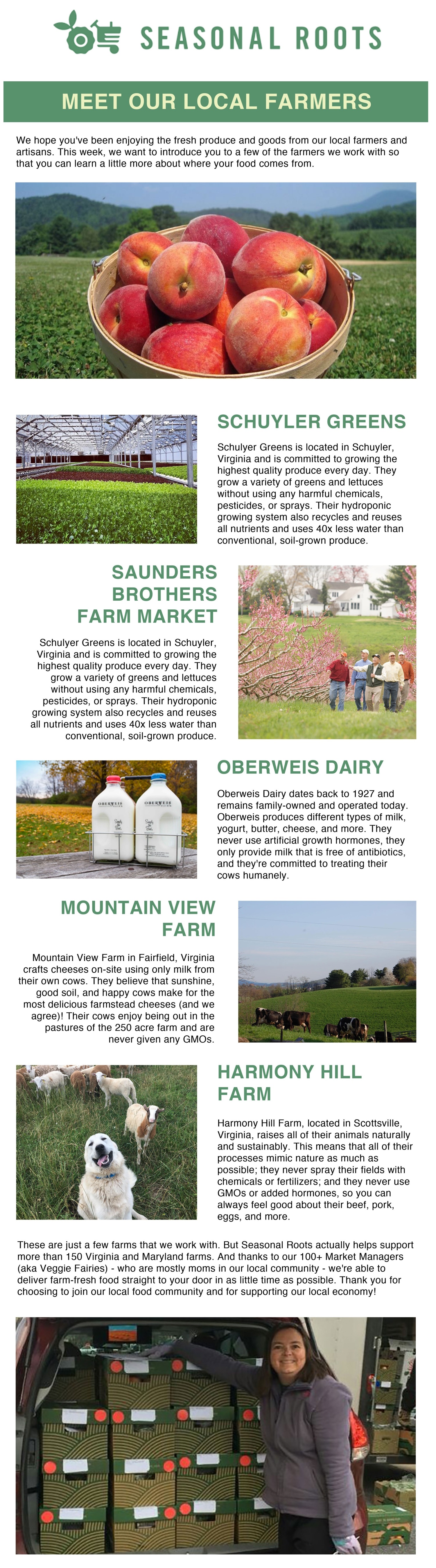 Since 2011, Seasonal Roots’ online farmers market has connected Virginia families with local family farmers who use sustainable, humane practices. Our neighborhood market managers – who believe in living better through scrumptious, healthy eating, being kind to animals, protecting the environment, and spreading joy – home-deliver freshly harvested produce, pastured eggs, grass fed dairy and meat, plus artisan fare. We empower our members to eat better and live better with more nutritious, flavorful food that’s good for us and good for the planet. More info at seasonalroots.com.