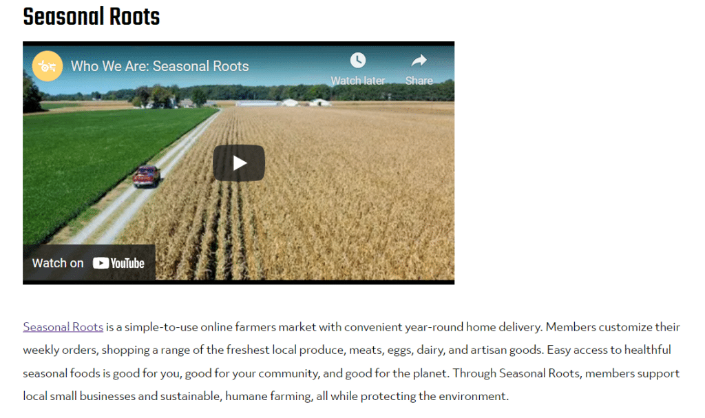 Since 2011, Seasonal Roots’ online farmers market has connected Virginia families with local family farmers who use sustainable, humane practices. Our neighborhood market managers – who believe in living better through scrumptious, healthy eating, being kind to animals, protecting the environment, and spreading joy – home-deliver freshly harvested produce, pastured eggs, grass fed dairy and meat, plus artisan fare. We empower our members to eat better and live better with more nutritious, flavorful food that’s good for us and good for the planet. More info at seasonalroots.com.