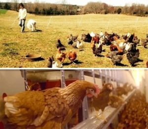 The top image is from a multi-generational family farmstead in the rolling hills outside Richmond, Va. Their hens spend their days in open pastures, foraging and engaging in natural behaviors like dust baths and flying short distances.