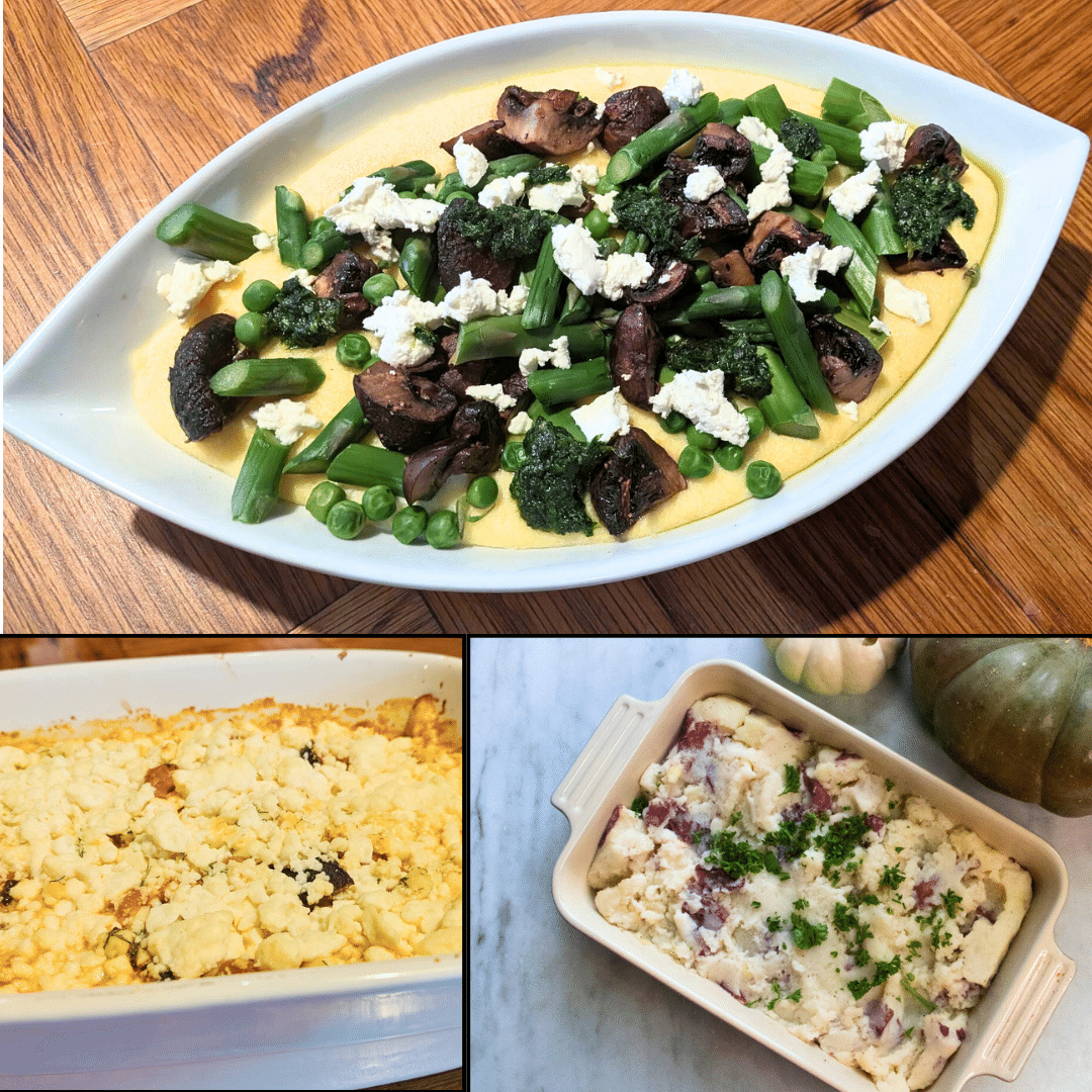 (32 oz container - serves 4-6) Creamy polenta with asparagus, peas, mushrooms, fresh herbs, and goat cheese. Great as a dinner side with lamb, ham or brisket, or even on a brunch table with the Blueberry French Toast Casserole.